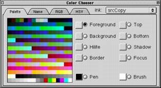 Accessing colorThe easiest way to color objects is to use the Color Chooser, which is accessed by clicking the Colors button in the Properties dialog box of any object (including the Stack Properties and Card Properties dialogs.) The easiest way to determine which color setting does what is just to experiment.Alternately, color can be scripted. This is most useful for stacks that need to change object colors dynamically via scripts in response to user actions, but it is also possible to assign colors during stack development by typing color commands into the message box. See MetaCard's Reference stack for more information on scripting color commands.