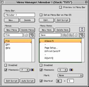To add the first of these items, click the "New Item" button above the Menu Items field and enter "Save". The item will be inserted into the list wherever the insertion arrow is aligned. Click on the "Mnemonic" checkbox and choose "S", which will underline that character in the menu on a Windows machine. Click the Shortcut checkbox and enter "S", which will show that character as the Command-key shortcut in the menu.&Save/S - Page Setup... &Print Card/P -